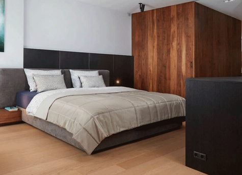 Dit is een typische industriële slaapkamer, kenmerkend zijn de neutrale kleuren zoals grijs, wit, bruin en zwart.