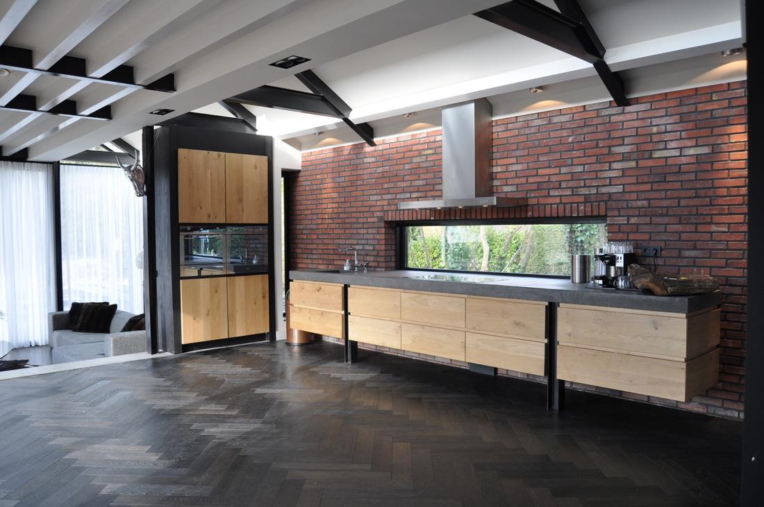 Stijlvol: donkere visgraatvloer in een donkere kleur, gecombineerd met een betonnen vloer