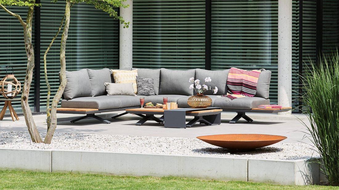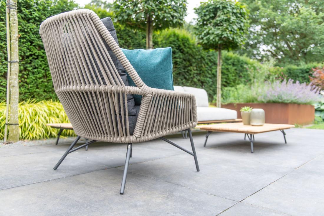 Een loungeset met veel uitstraling door het gebruik van stof, hout en metalen potenCombineer stijlen met materialen; rotan en aluminium combineert elegant en robuust