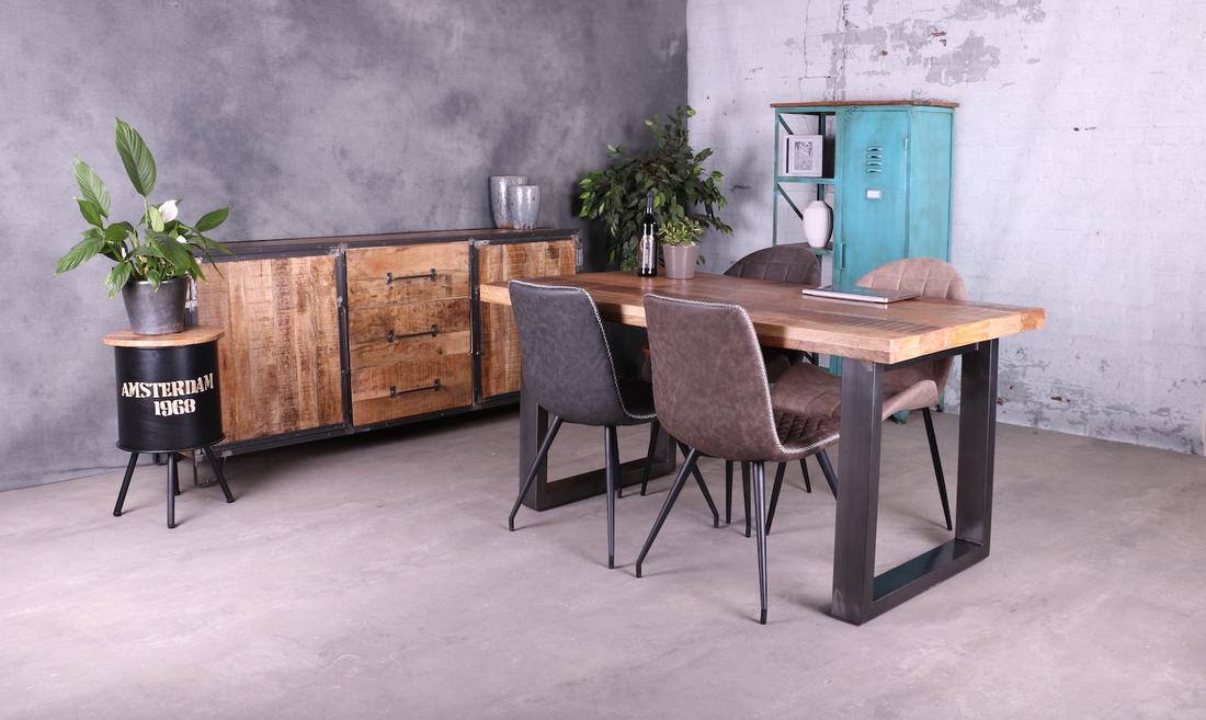 Combineer verschillende stijlen; industrieel dressoir gecombineerd met houten bijzettafeltjes