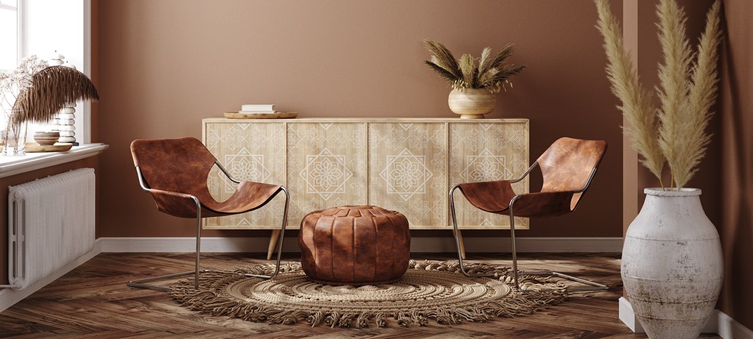 Een warme kleur als deze terracotta kleur staat prachtig met beige meubelen en tinten. Zie je ook hoe mooi glad de muur is? Dat komt door het schuren!