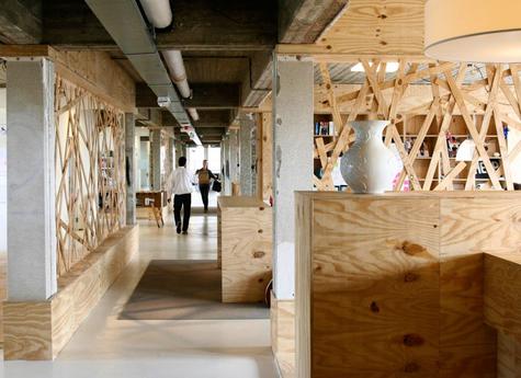 Er kwamen open werkplekken voor de verschillende afdelingen. Het betonnen plafond werd blootgegeven en de buizen en bedradingen werden zichtbaar. Dit past erg goed bij de bouwstijl van het gebouw en brengt ook meer hoogte in het kantoor. Voor de isolatie en om meer warmte en sfeer te brengen is één muur helemaal bekleed met sloophout. De grote industriële lampen passen perfect bij de sfeer van het kantoor. Een modern en kleurrijk café zorgt voor een informele plek waar de werknemers kunnen ontspannen en socializen.